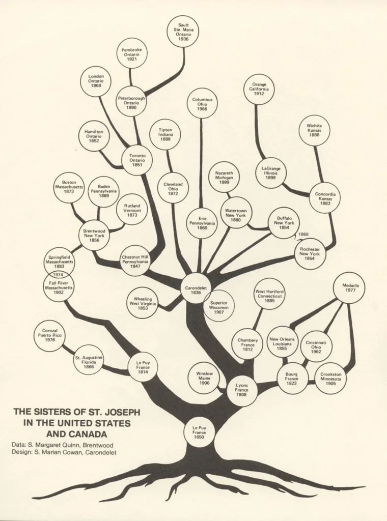 Three of them moved to Cahokia, Illinois. In 1847, another Sister from Lyon, Mother John Fournier, went to Philadelphia to care for orphans. In 1854, Sisters went from Carondelet to Buffalo to teach the Deaf, and also travelled to Rochester. From Buffalo, Sisters went to Watertown, New York, and from there to Erie, Pennsylvania and Kalamazoo, Michigan. From Rochester, Sisters went to Concordia, Kansas.